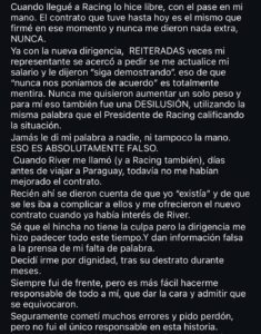 En primer lugar, se despidió de Racing: “Defendí los colores junto a mis compañeros, al profe Costas y al cuerpo técnico, a los que les agradezco. Logramos juntos la obtención de la Copa Sudamericana y la Recopa. Pero también sé de dónde vengo, y por todo lo que he pasado. Desde muy chico me hice solo, nadie me regaló nada”.