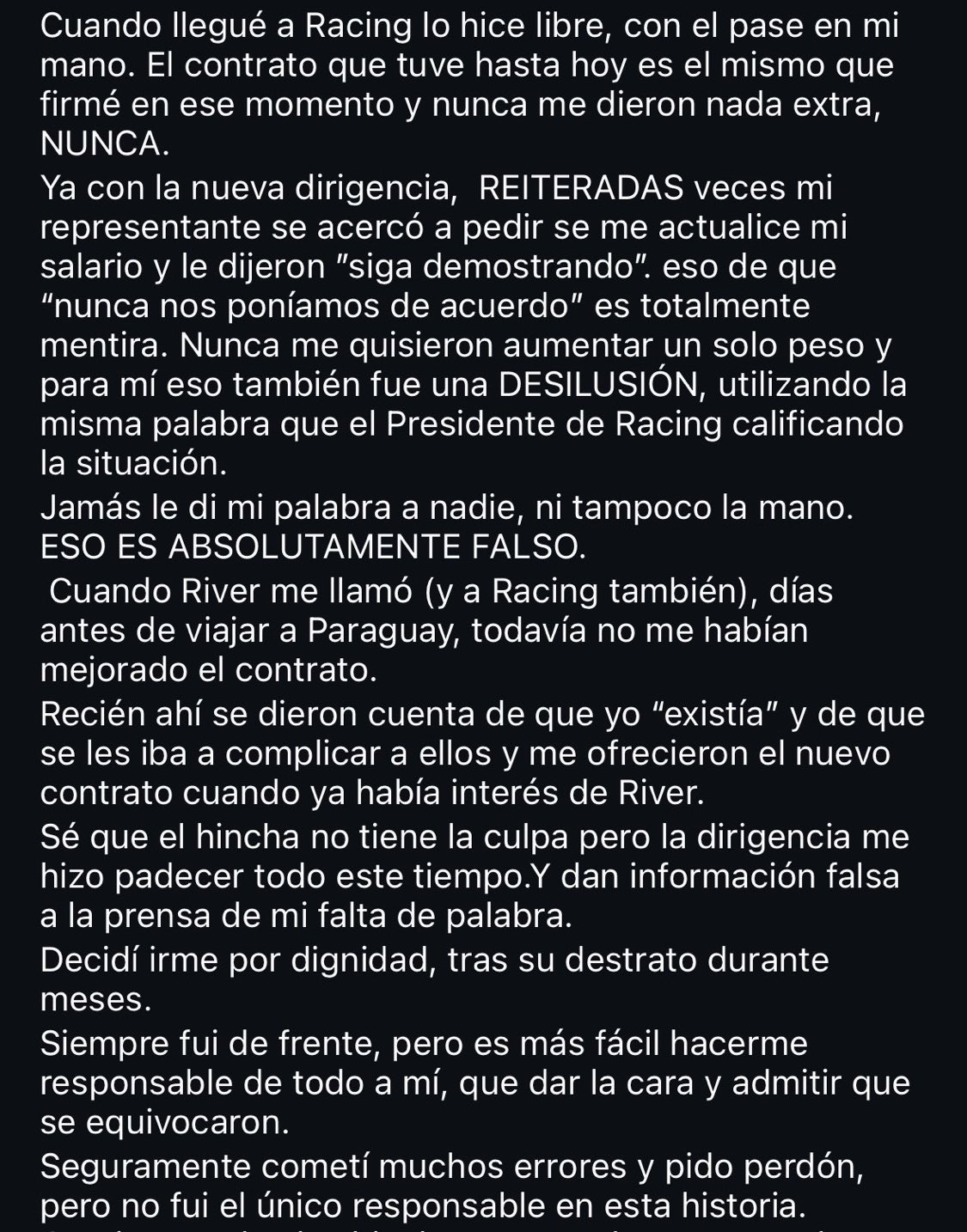 Junto con esto, le tiró con todo a los directivos del equipo de Avellaneda: “Cuando llegué a Racing lo hice libre, con el pase en mi mano. El contrato que tuve hasta hoy es el mismo que firmé en ese momento y nunca me dieron nada extra, NUNCA. Nunca me quisieron aumentar un solo peso y para mí eso también fue una DESILUSIÓN”.