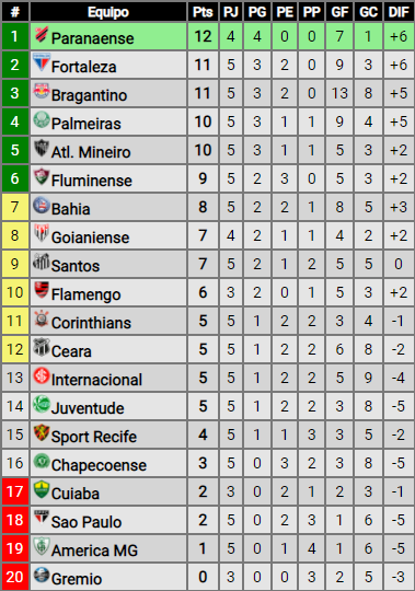 Terminó la Fecha 5 del Brasileirão 2021 y Athletico Paranaense sigue invicto con pleno de victorias, es el nuevo puntero y todavía tiene un partido pendiente, pero Fortaleza, Bragantino, Palmeiras y Atlético Mineiro lo escoltan de cerca. Por su parte, Gremio sigue último sin unidades pero tiene dos partidos menos.