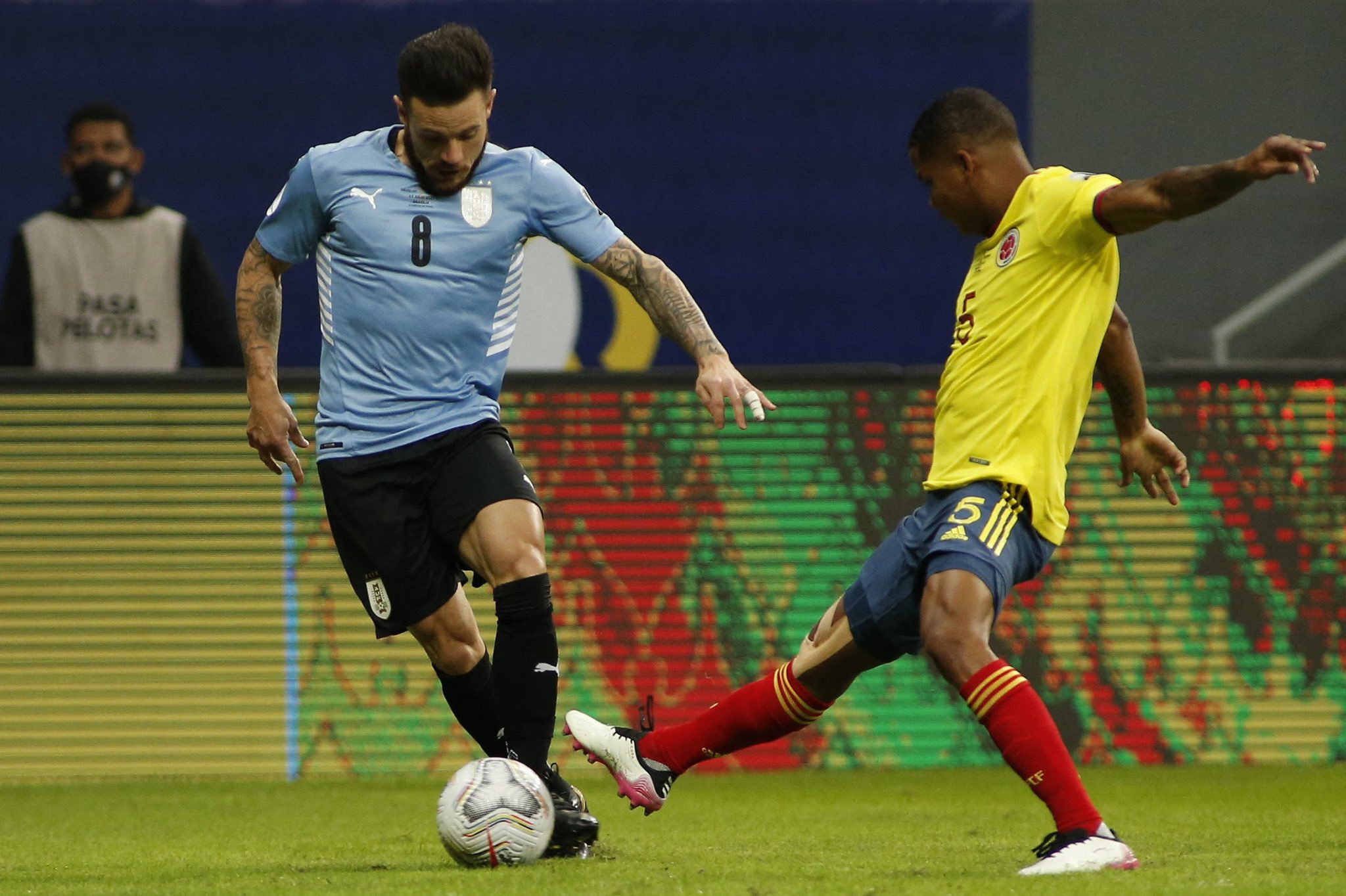 1-Yerri Mina impasable: El defensor de Colombia fue una de las figuras del encuentro, ya que a lo largo del partido fue una muralla, fue muy seguro tanto por abajo como por arriba, cortó muy bien los contra ataques que quería iniciar cuando Colombia. Supo contener muy bien tanto Giorgian de Arrascaeta, Edinson Cavani y a Luis Suárez cuando fueron a atacar por su lado.