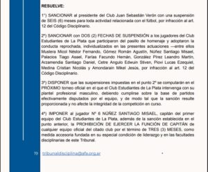 Según informó el organismo, Verón recibió seis meses de suspensión, mientras que el capitán del equipo, Santiago Núñez, fue castigado con tres meses sin poder ejercer el rol con la cinta. Además, el resto de los futbolistas involucrados deberá cumplir dos fechas de suspensión, aunque recién en el próximo torneo.