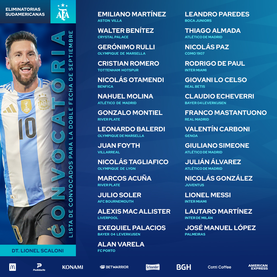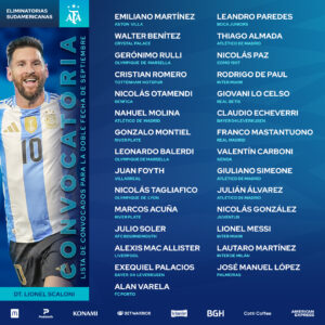 Entre los nombres elegidos hay confirmaciones importantes y también bajas inesperadas: con respecto a la prelista difundida la semana pasada, quedaron afuera Facundo Medina y Ángel Correa, dos futbolistas habituales en las citaciones. En tanto, Claudio Echeverri, Alan Varela y José Manuel López se mantuvieron en la nómina definitiva.