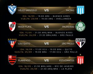 El primer duelo entre argentinos será el que protagonizarán Racing y Vélez, con partidos los martes 16 y 23, ambos a las 19:00. Por su parte, River tendrá un desafío de alto vuelo frente a Palmeiras: la ida será el miércoles 17 en el Monumental y la revancha, el miércoles 24 en San Pablo, en el Allianz Parque.