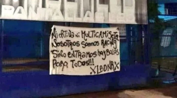 “Ni ortivas ni multicamisetas. Nosotros somos Racing. Si no entramos, hay balas para todos. LBDNR” firma la banda dirigida por parte del “Negro” Ramos, una facción de la antigua Guardia Imperial, que actualmente pelea por vuelta al poder.